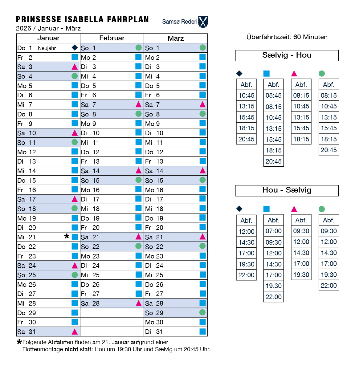 Zunächst sind Tickets für die Fähre Prinsesse Isabella (Hou – Sælvig) von Samsø Rederi nur für Januar und Februar verfügbar. Der Grund dafür ist, dass