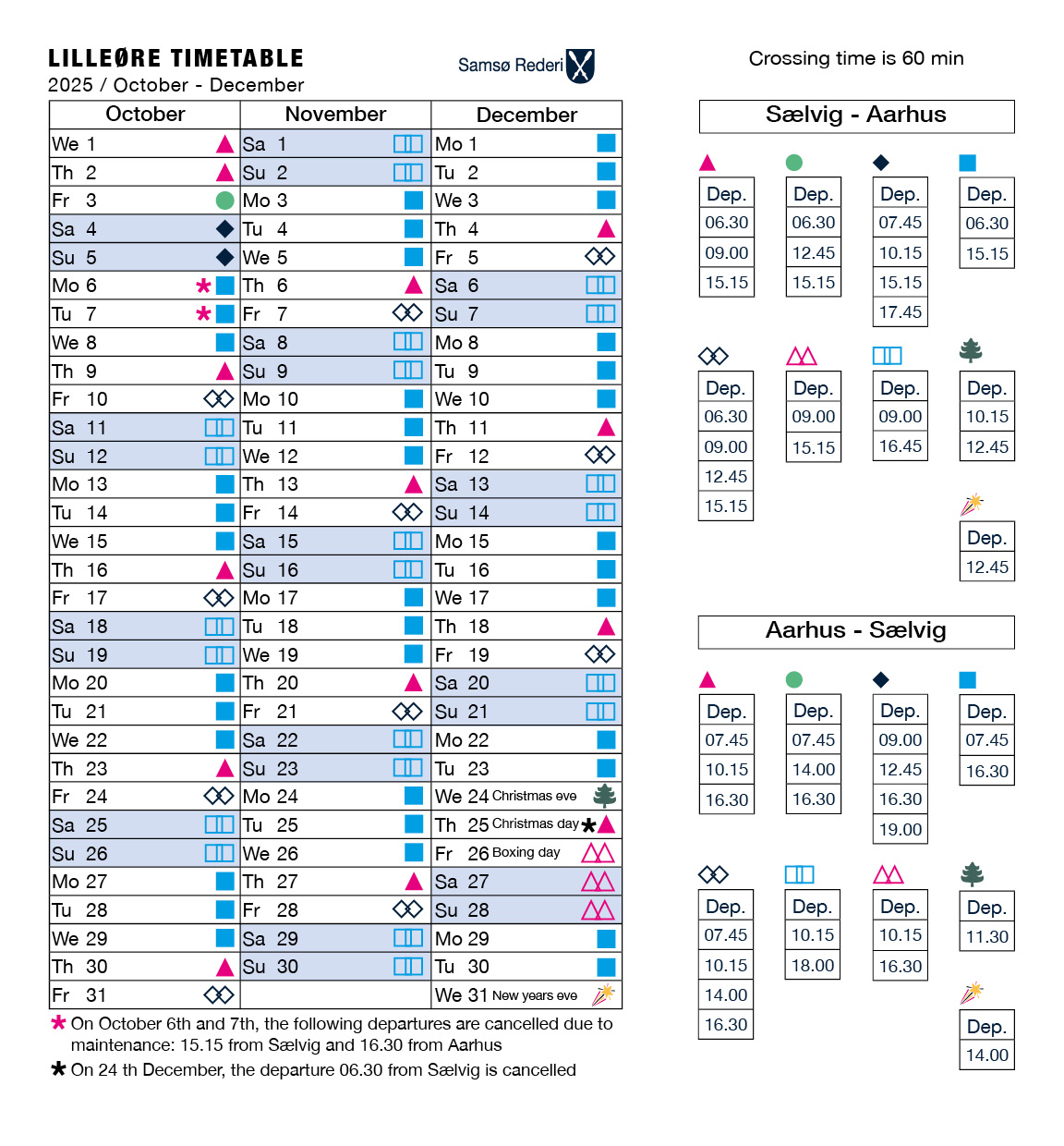 Here you find the timetable for the fast ferry that sails between Aarhus and Sælvig.